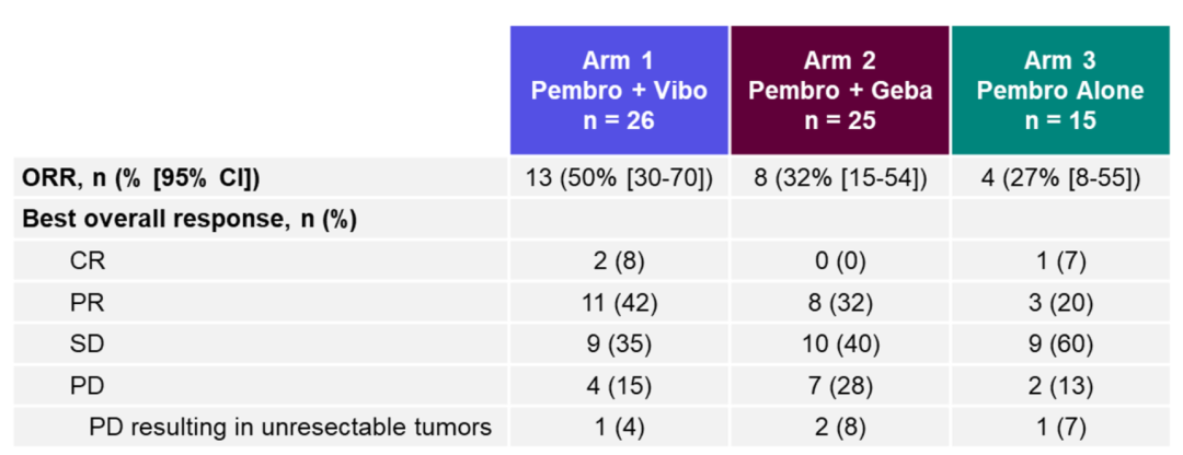 该研究对照了三个治疗方案对皮肤黑色素瘤的新辅助效果,如前年的MASTERKRY研究,K+TVEC(疱疹病毒改构的溶瘤病毒)没能从有效率和OS上战胜K药单药一样,这个研究也并未显示出小RNA溶瘤病毒联合PD-1单抗与单药相比的优势。但值得注意的是,这个V937是一种野生型柯萨奇病毒A21,是一种小RNA溶瘤病毒,不是目前的主流DNA病毒,其有效性是否一致不得而知。其次,该组中BRAF-V600突变比例明显高于其他两组,可能一定程度上影响了结果;再者,我国开展的溶瘤病毒(疱疹病毒改构)+PD-1单抗新辅助肢端黑色素瘤的结果显示了70%的病理缓解率(远优于单药PD-1单抗),可见不同亚型黑色素瘤,不同种类溶瘤病毒疗法会呈现不同结果。