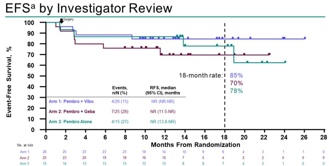 从18个月生存曲线看,联合组的18个月EFS和RFS优于单药组。