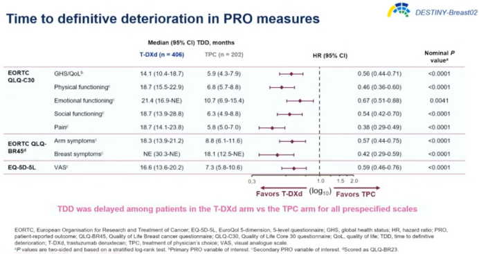 该研究结果表明了与医生选择的化疗(TPC)相比,T-DXd能为患者带来了更好的生活质量,且接受T-DXd治疗的患者生活质量至明确恶化时间也被延缓了。更具体来讲,T-DXd组的患者总体健康状况、整体生活质量、身体机能和疼痛症状方面至明确恶化的时间要比医生选择化疗的患者晚。DESTINY-Breast02研究和患者报告结局数据验证了T-DXd对T-DM1耐药且HER2阳性的转移性乳腺癌患者的获益。