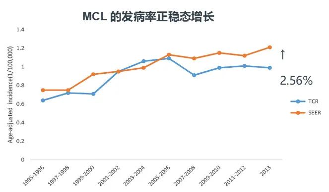 套细胞淋巴瘤(MCL)是一种老年性B细胞肿瘤,起源于淋巴结套区,发病率占成人非霍奇金淋巴瘤(NHL)的3%~10%,常见于男性,男女比例3:1,欧美的中位年龄为68岁,在亚洲国家的中位发病年龄稍低,在60岁左右。1995年至2013年美国SEER数据库的数据显示,MCL发病率的在逐年增加(图1)。