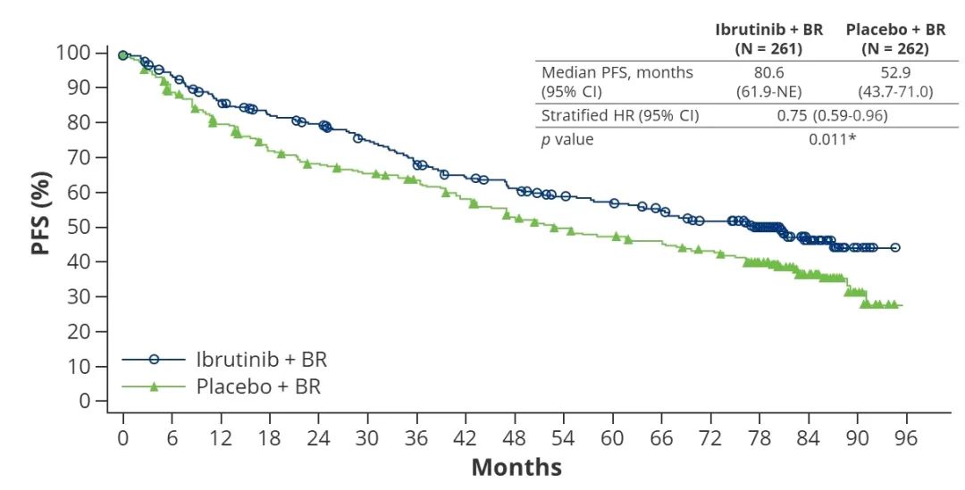 图3.SHINE研究结果:BR+伊布替尼与对照组的无进展生存率的比较
