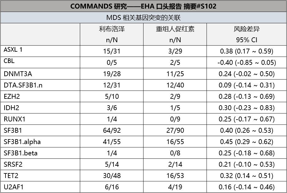即将在EHA年会上发布的数据包括了与ASCO公布的结果相一致的疗效与安全性数据。这些数据显示,对于常见的MDS基因突变(SF3B1、SF3B1a、ASXL1、TET2、DNMT3A、EZH2、IDH2、U2AF1),罗特西普的治疗结果优于重组人促红素,并且实现临床获益的可能性更高,无论总体突变负担如何。