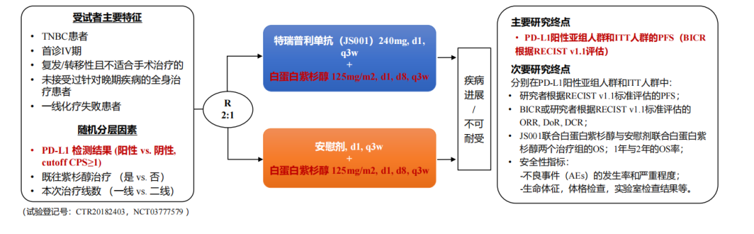 TORCHLIGHT研究(NCT04085276)是一项随机、双盲、安慰剂对照的多中心III期临床研究,旨在于首诊IV期或复发转移的三阴性乳腺癌(TNBC)患者中比较特瑞普利单抗联合注射用紫杉醇(白蛋白结合型)与安慰剂联合注射用紫杉醇(白蛋白结合型)的疗效和安全性。该研究阳性结果的公布是中国乳腺癌免疫治疗领域的首次突破,将为三阴性乳腺癌患者免疫治疗带来更多选择。