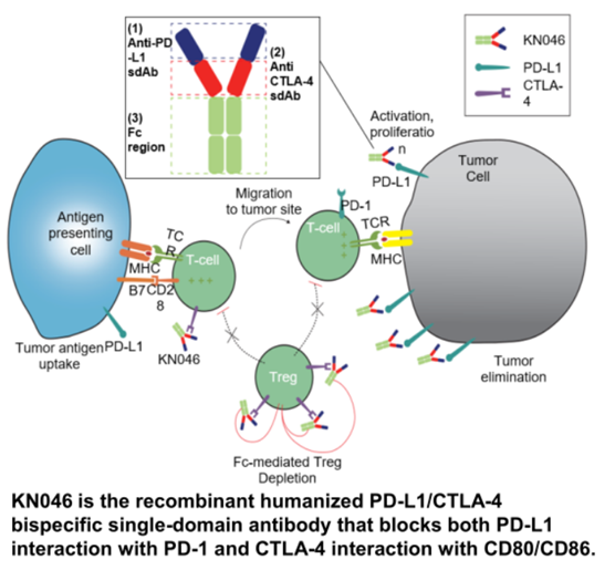 除乳腺癌(BC)和胃癌外,HER2在其他实体肿瘤中也广泛表达,如结直肠癌(CRC)、非小细胞肺癌(NSCLC)、胆囊癌(GBC)、肾盂癌(RPC)、胰腺导管腺癌(PDAC)等。免疫治疗联合HER2靶向治疗的报道有限。KN026是一种新型双特异性抗体,可同时结合两个不同的HER2表位(图1)。KN046也是一种新型双特异性抗体,可阻断PD-L1与PD-1的相互作用以及CTLA-4与CD80/CD86的相互作用(图2)。