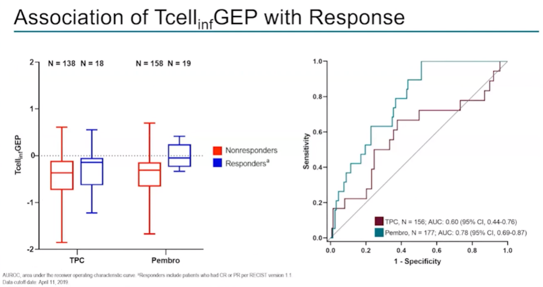 亚组分析提示,无论Tcellinf GEP水平高或低,单药化疗组中位OS均为11m;而在帕博利珠单抗组,低Tcellinf GEP人群中位OS仅有5.6m、高Tcellinf GEP人群则可达12.7m。表明Tcellinf GEP富集人群从免疫治疗中获益更多,Tcellinf GEP水平对帕博利珠单抗组的预测效能优于单药化疗组。