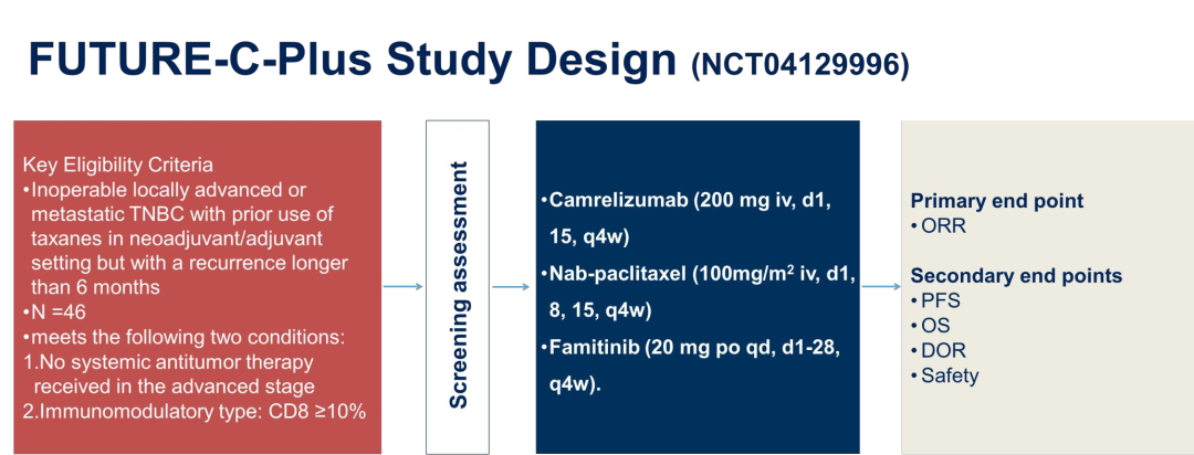 研究背景:在FUTURE临床研究中,卡瑞利珠单抗(camrelizumab)和白蛋白紫杉醇在难治性免疫调节型晚期三阴性乳腺癌中显示出有良好的抗肿瘤活性。抗血管生成药物具有促进免疫浸润的研究报道。而法米替尼(famitinib)是一种针对VEGFR-2,PDGFR和c-kit的酪氨酸激酶抑制剂。FUTURE-C-PLUS临床研究(NCT04129996)将法米替尼加入到卡瑞利珠单抗和白蛋白紫杉醇联合治疗中,是一项单臂、Ⅱ期研究,以评估这种新的三联组合治疗策略在免疫调节型晚期三阴性乳腺癌患者中的疗效。研究设计和主要终点ORR之前已有报道(ASCO 2021,摘要1007)。最终的PFS数据已发表在Clinical Cancer Research(Clin Cancer Res 2022;28:2807–17)。在这里,我们报告了该试验的中位总生存期数据。