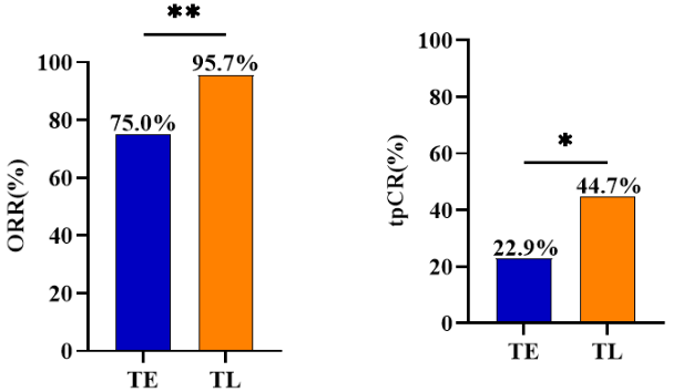 研究结果:从2019年6月至2022年11月,共筛选患者97例,最终入组95例。中位年龄为49岁,Ⅰ期患者9例(9.5%),Ⅱ期患者61例(64.2%),Ⅲ期患者25例(26.3%)。95例患者按1∶1进行分组,TL组47例,TE组48例。TL组的tpCR率为46.8%(22/47),明显高于TE组22.9%(11/48),OR=2.960(95%CI:1.223~7.164,P=0.016)。TL组的客观缓解率95.7%(45/47),明显高于TE组75.0%(36/48),OR=27.500(95%CI:1.576~35.683,P=0.011)。TE组Ⅲ/Ⅳ级中性粒细胞减少症为41.0%(9/22)明显高于TL组7.7%(2/26),OR=8.308(95%CI:1.557~44.320,P=0.013),其余不良反应方面两组无明显差异。