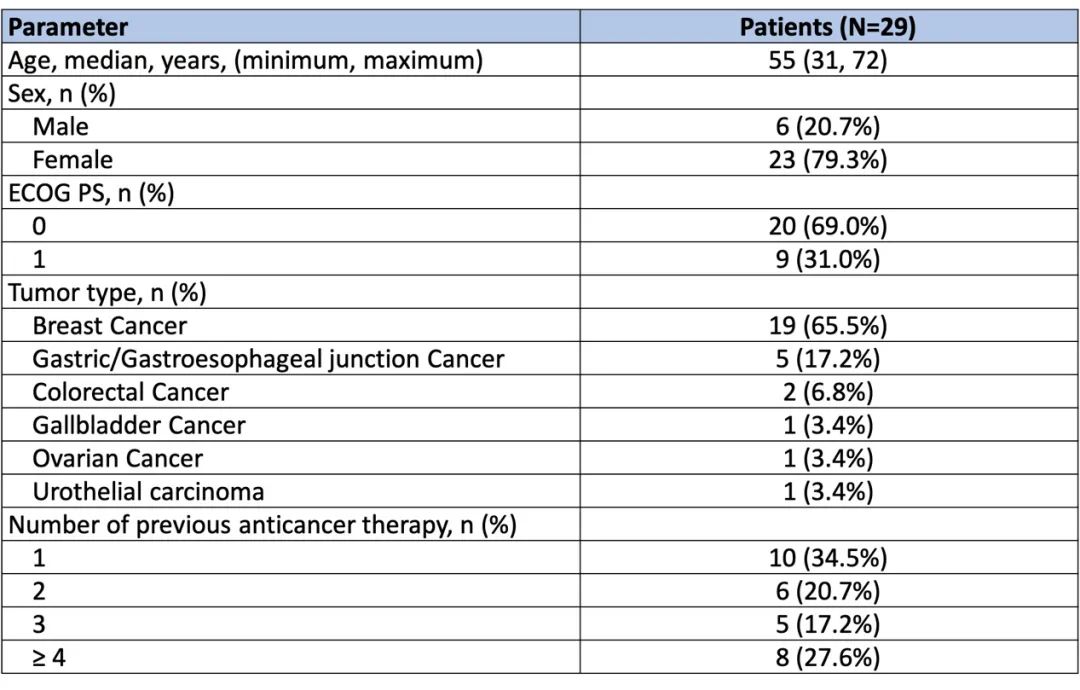 最常见的治疗相关不良事件见表2。最常见的≥3级治疗相关不良事件(TRAE)(≥10%)是周围神经病变(15/29,51.7%)。研究期间未发现间质性肺疾病。9例患者因周围神经病变停止研究治疗。2例患者因住院治疗发生与治疗相关的严重不良事件:周围神经病变。