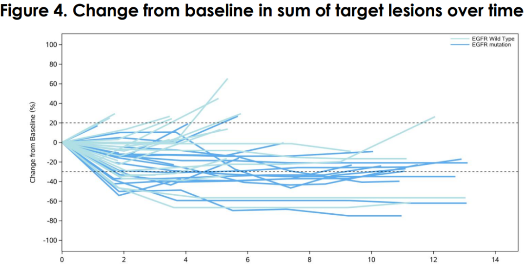 这项研究入组的43例患者中,EGFR突变型和EGFR野生型NSCLC患者各占50%左右(22例 vs 21例),其中76.7%(33/43)的患者既往接受过针对转移性疾病的2种及以上方案治疗。在EGFR突变人群中,所有患者均为EGFR-TKI耐药,50%的患者至少接受过一种化疗方案,59.1%的患者接受过第三代EGFR-TKI治疗。所有EGFR野生型患者均为抗PD-1/L1治疗失败。