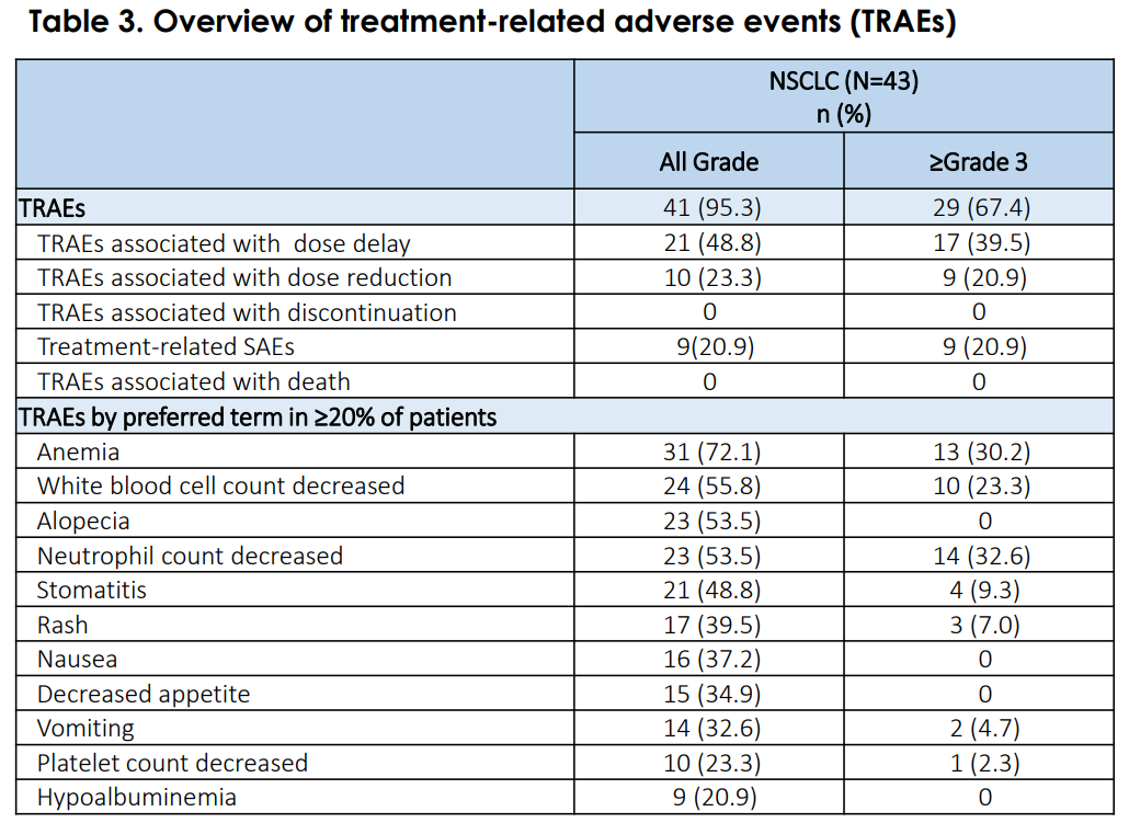 在安全性方面,SKB264的主要治疗相关不良事件(TRAEs)为血液学毒性,包括贫血、白细胞计数降低和中性粒细胞计数降低等,通过支持治疗可以得到控制。大多数血液学相关不良事件在开始SKB264治疗后两个月内出现,在经过粒细胞集落刺激因子或促红细胞生成素治疗后恢复。在延迟给药的患者中,约80%的患者最长延迟给药时间不超过2周,且再次延迟给药的发生率很低。在治疗过程中没有观察到神经毒性、眼毒性或药物相关的间质性肺病(ILD)/非感染性肺炎的发生。