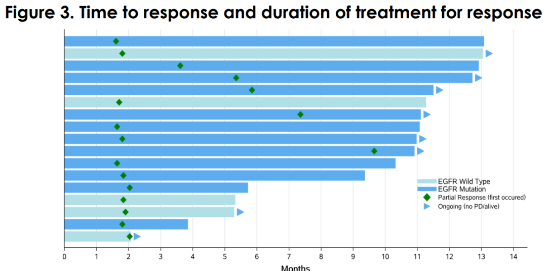 EGFR突变患者的ORR为60%(12/20),DCR为100%(20/20),mDoR为9.3个月,中位无进展生存期(mPFS)为11.1个月,12个月OS率为80.7%。EGFR野生型患者的ORR为26.3%(5/19),DCR为89.5%(17/19),mDoR为9.6个月,12个月OS率为60.6%。