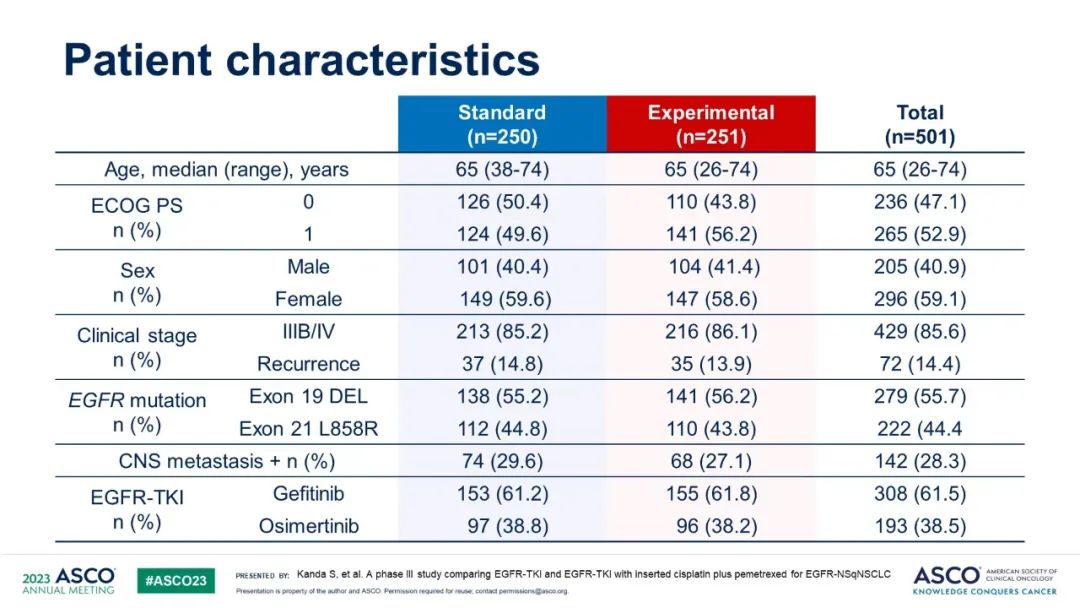 试验组:251例患者从第1日至第56日每日接受吉非替尼或奥希替尼治疗,之后休息2周;然后在第71、92和113日接受3个周期的顺铂和培美曲塞治疗,在第134日恢复吉非替尼或奥希替尼治疗,治疗持续至疾病进展。