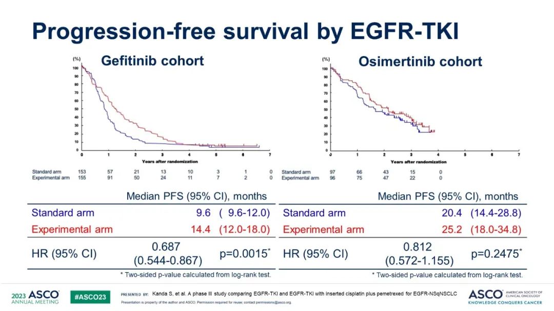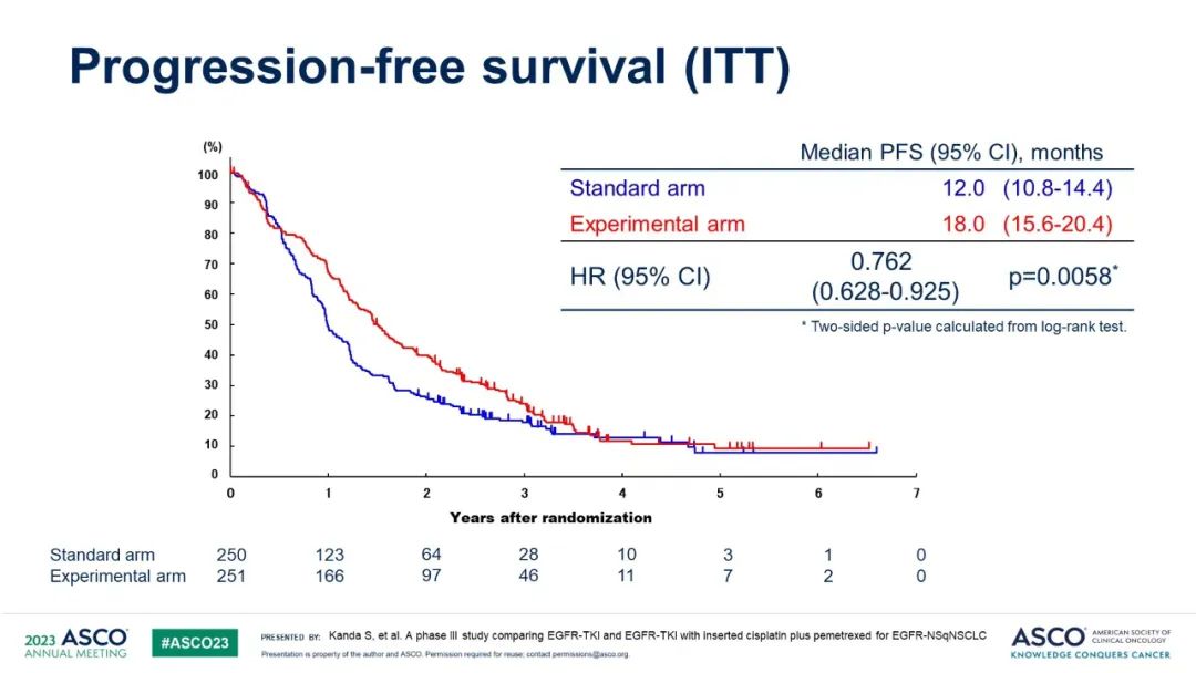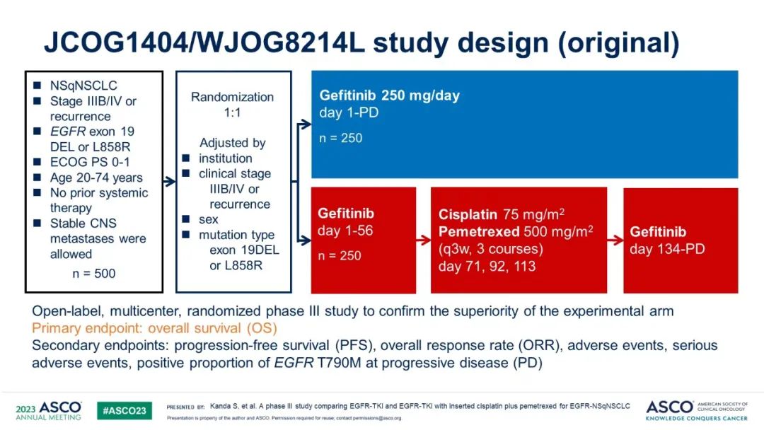 参考文献:Kanda, S, et al. A phase III study comparing EGFR tyrosine kinase inhibitor (EGFR-TKI) monotherapy and EGFR-TKI with inserted cisplatin (CDDP) plus pemetrexed (PEM) as a first-line treatment in patients (pts) with advanced non-squamous non–small-cell lung cancer (NSqNSCLC) harboring EGFR activating mutation (EGFR-NSqNSCLC): JCOG1404/WJOG8214L, AGAIN study. 2023 ASCO. DOI: 10.1200/JCO.2023.41.17_suppl.LBA9009