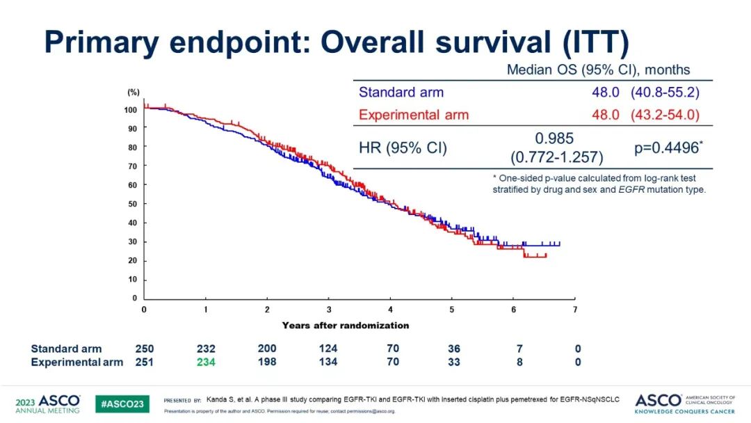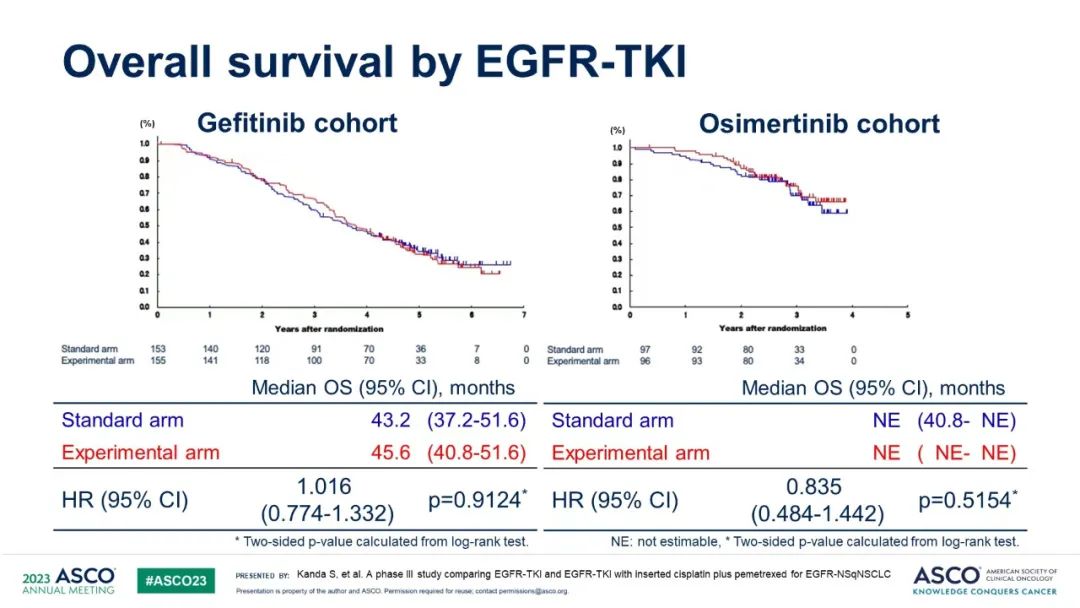 然而,试验组和标准组的中位OS无差异(48个月vs 48个月;HR=0.985;95% CI: 0.772-1.257)。对两个EGFR-TKI药物进行分析,无论EGFR-TKI采用吉非替尼(试验组和标准组分别为45.6个月vs 43.2个月;HR=1.016;95% CI: 0.774-1.332),还是奥希替尼(两组均未达到[NE];HR=0.835;95% CI: 0.484-1.442),均未观察到OS获益。