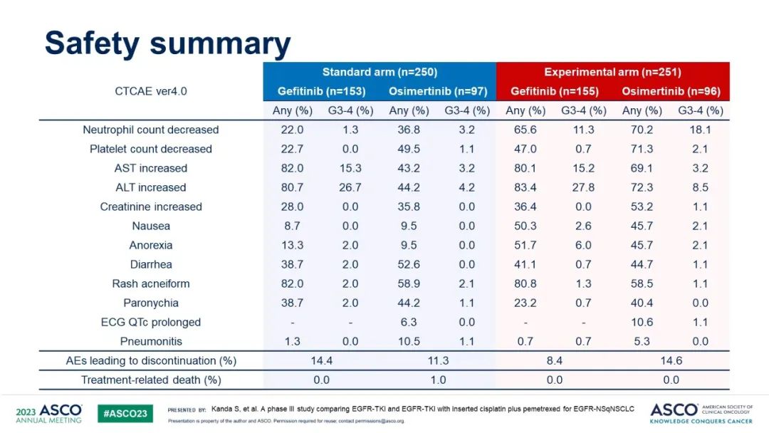 在标准组,不良反应(AE)导致14.4%接受吉非替尼和11.3%接受奥希替尼的患者停药;在试验组中,AE导致8.4%接受吉非替尼+化疗和14.6%接受奥希替尼+化疗的患者停药。