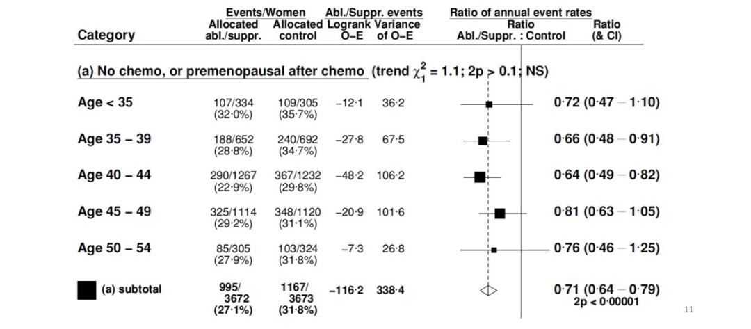 该荟萃分析提示,对于绝经前ER阳性女性乳腺癌患者,卵巢切除/抑制可显著降低乳腺癌15年复发风险和20年死亡的风险,较未切除/抑制患者取得更多获益;且无论患者年龄分层如何、淋巴结状态如何,亦能通过卵巢切除/抑制取得生存获益1。