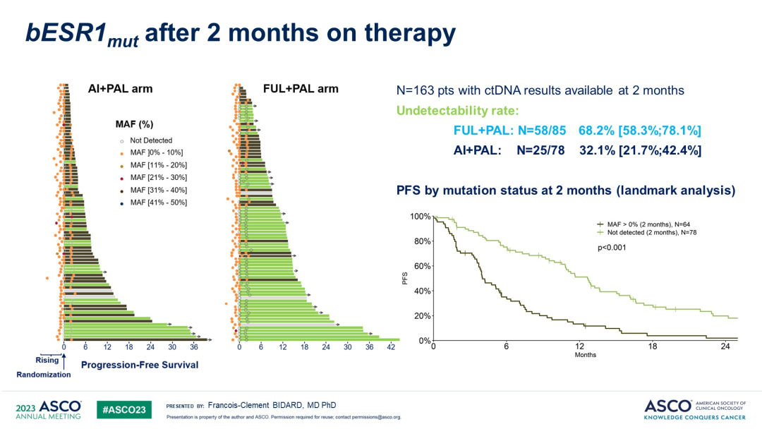 未经AI治疗的初治晚期HR+/HER2-乳腺癌患者的ESR1突变比例非常低,PADA-1研究对已经出现ESR1突变的患者进行每2个月一次的持续ESR1状态监测。今年ASCO再次更新了PADA-1的随访结果,一方面是探索ESR1的突变类型,另一方面则研究不同ESR1突变类型对研究结果的影响。此次更新的结果显示,在随机分组治疗2个月后,FUL+PAL组较继续AI+PAL组bESR1m清除率为68.2%vs 32.1%,p<0.001(图2);清除率越高,患者PFS表现越好;两组bESR1m清除的持续时间为7.3个月vs 1.9个月,提示ESR突变状态是动态变化的。