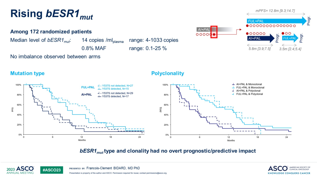 此次数据公布还发现,在突变类型方面,bESR1m最常见的是Y537S位点突变,约有26%左右的患者是多克隆突变(图3)。