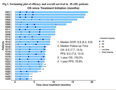 截至2023年2月27日,共有29名患者参与本研究,其中一名患者因病理检查为外周T细胞淋巴瘤而被剔除。中位年龄为34岁(21-68岁),IIB期10.7%,III期25.0%,IV期64.3%。所有符合标准的28名患者均接受了至少两个周期的替利珠单抗单药治疗和PET-2疗效评估,疗效和总生存率的曲线图如图1所示。PET-2后,CR率为28.6%(8/28),总有效率(ORR)为96.4%(27/28),1例患者(3.6%)出现PD。截至PET-3,21例患者完成了所有治疗,其余7例仍在治疗中。19名患者(90.5%,19/21)在治疗期间实现了CR,1名患者(4.8%)实现了PR,1名患有PD,ORR为95.2%。在随访期间,PET-2中的8名CR患者中,有6名在6个周期的替雷利珠单抗单药治疗后仍保持CR,而无需化疗。该研究耐受性良好,没有出现与治疗相关的SAE或死亡。免疫相关AE主要集中在1/2级,3/4级血液学毒性主要发生在联合治疗期间。