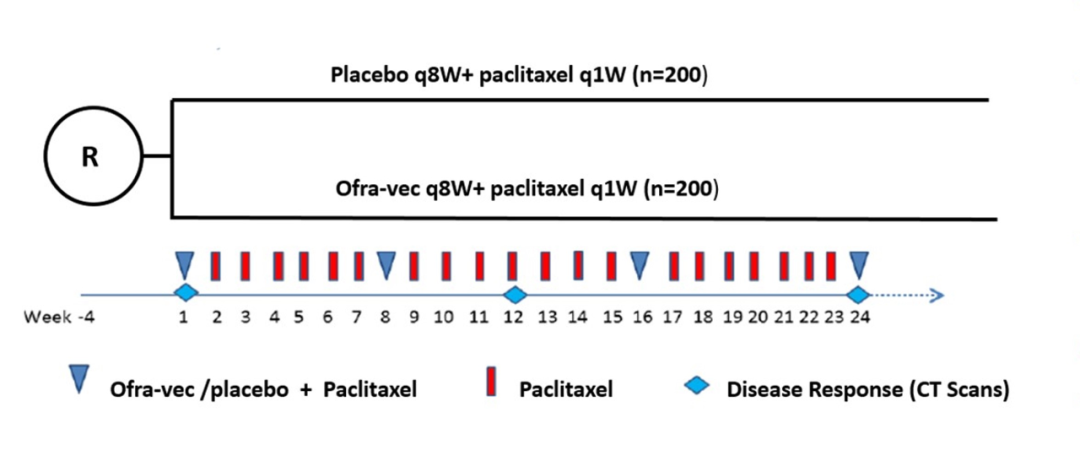 这是一项随机、安慰剂对照、双盲、多中心Ⅲ期试验(NCT03398655),探究VB-111+紫杉醇周疗 vs. 紫杉醇+安慰剂治疗铂耐药复发性卵巢癌(PROC)患者的疗效和安全性。患者按1:1随机分配,每8周接受VB-111(1×1013病毒颗粒)静脉注射(IV) +每周静脉注射紫杉醇80 mg/m2或安慰剂+紫杉醇周疗直至疾病进展。主要终点(双终点)为盲态独立中心评审(BICR)评估的总生存期(OS)和无进展生存期(PFS)。