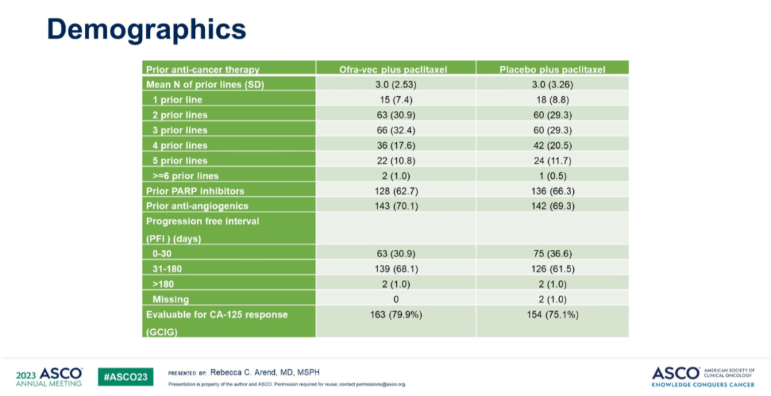 患者的平均年龄在两个治疗组分别为63和61.1岁,大部分是白人(在两个治疗组分别占80.9% vs. 76.6%),III期(58.8% vs. 67.8%)和IV期(30.9% vs. 24.4%)患者占比更高,绝大部分患者的ECOG PS评分为0(61.8% vs. 62%)和1(38.2% vs. 36.6%)。两个治疗组的患者是既往均接受过平均3线抗癌治疗的重度治疗患者,并且每组中60%-70%的患者之前接受过抗血管生成药物和/或PARP抑制剂治疗。