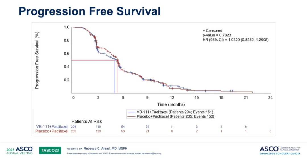 接受VB-111治疗的患者的中位PFS为5.29个月,而对照组为5.36个月(风险比 [HR]=1.03;95% CI: 0.83-1.29;p=0.7823)。
