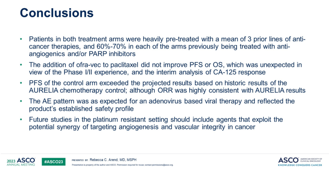在紫杉醇周疗基础上联用VB-111对铂耐药卵巢癌没有改善其PFS和OS。基于I/II期研究和OVAL试验中期分析,此次发布的结果令人意外。OVAL试验对照组的PFS超过了基于AURELIA化疗对照组的历史数据,尽管ORR与 AURELIA结果高度一致。AE与基于腺病毒的病毒疗法的预期结果一致。研究作者认为,关于铂耐药患者的未来研究,应包括针对“抗血管生成与血管完整性的协同作用”的药物。