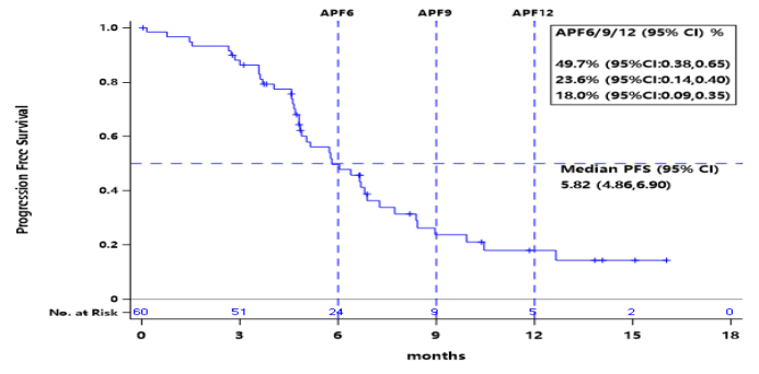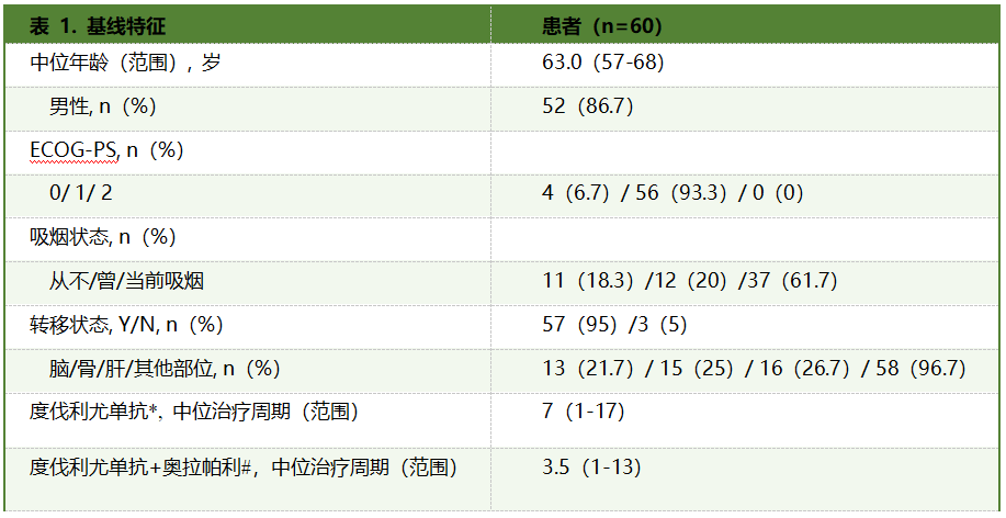 截至2023年1月26日,本研究共纳入60例患者,中位年龄63岁,其中男性56例(86.7%),中位随访时间为10.5个月。基线参数见表1。