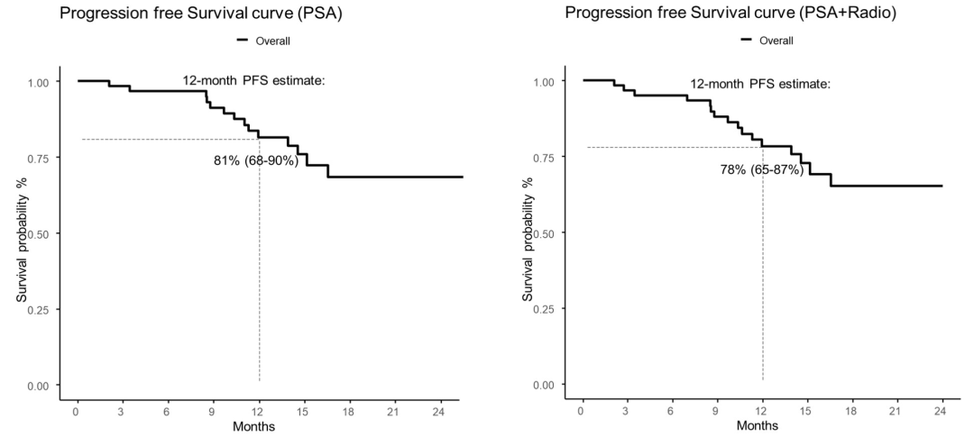 △单臂2期CASCARA研究:ADT+卡巴他赛/卡铂+阿比特龙的无PSA进展、无PSA和影像学进展生存曲线