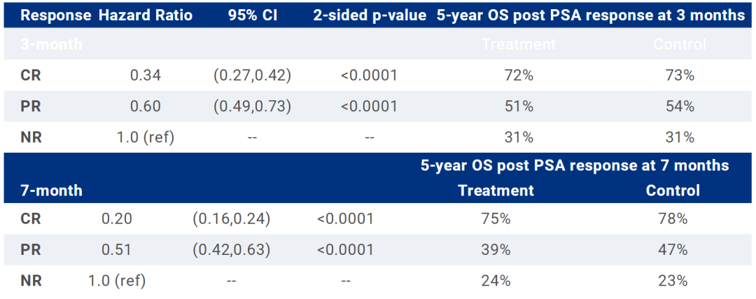 在另一项3期SWOG S1216研究(ADT+orteronel vs ADT+比卡鲁胺治疗mHSPC)的探索分析中,评价了3个月和7个月PSA缓解(PSA≤0.2 ng/mL定义为完全缓解/CR,2-4ng/mL定义为部分缓解/PR,>4ng/mL定义为无缓解/NR),结果同样显示,PSA缓解程度越好,患者的5年OS率越高,PSA缓解深度与患者生存预后显示很好的密切相关性。
