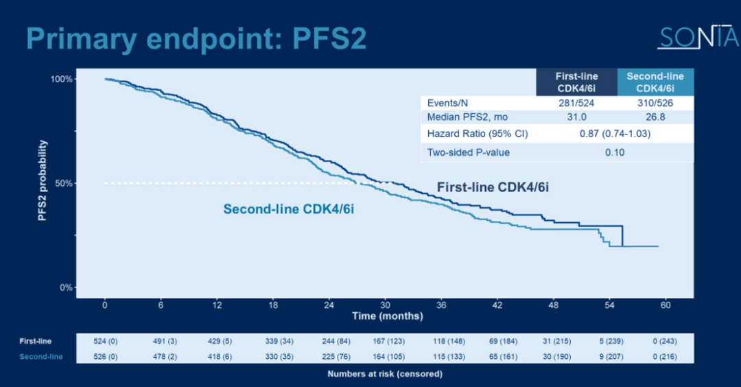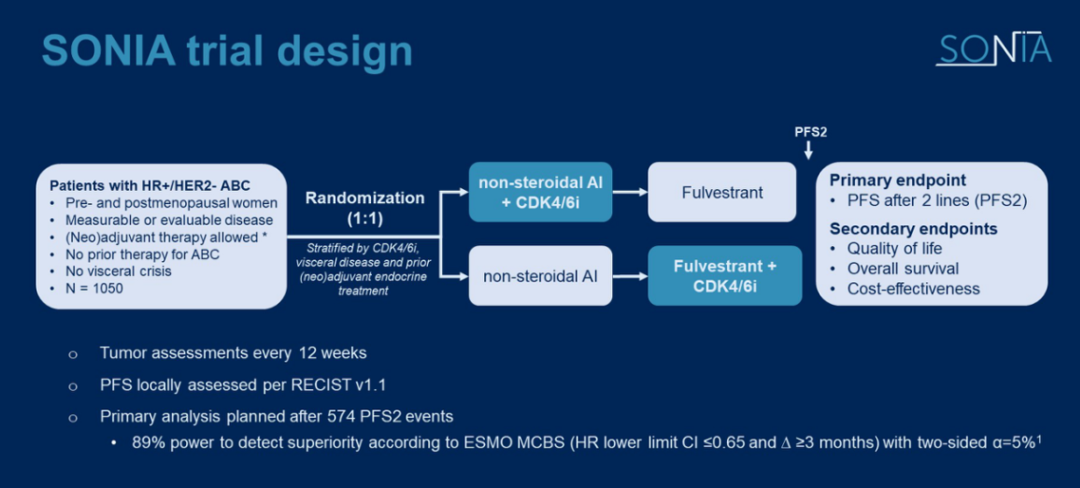 今年ASCO大会上,SONIA研究结果的公布进一步为CDK4/6抑制剂的使用时机提供了答案。SONIA研究在荷兰74家医院纳入了未接受过治疗的ABC、疾病可测量或可评估且WHO体能状态评分为0~2分的绝经前和绝经后女性(N=1050)。允许(新)辅助治疗(非甾体芳香化酶抑制剂)后的无病间隔期为12个月。以1∶1的比例将患者随机进行分组,一组接受NSAI+CDK4/6抑制剂作为一线治疗,之后用氟维司群(F)进行治疗直至出现疾病进展(方案A);另外一组患者接受NSAI作为一线治疗,之后用F+CDK4/6抑制剂进行治疗直至出现疾病进展(方案B)。可供选择的CDK4/6抑制剂包括阿贝西利、哌柏西利、瑞波西利,由治疗医师决定。主要终点是从随机分组至当地研究者判定的第二次客观疾病进展或死亡的时间(PFS2)。次要终点包括OS、安全性、生活质量和成本效益。