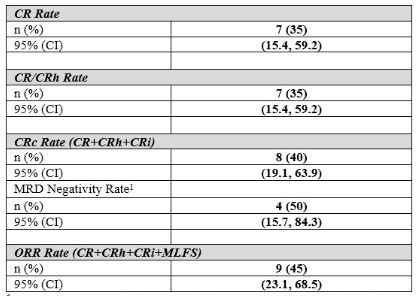 在这项Ib期研究中,我们重点关注携带NPM1突变的复发难治患者。我们发现该治疗方案在患者中耐受良好,客观缓解率(ORR)为45%,完全缓解(CR)率为35%。更多的分析仍在进行中,并且目前正在进行II期研究。随着时间的推移,我们将会有更多的了解。