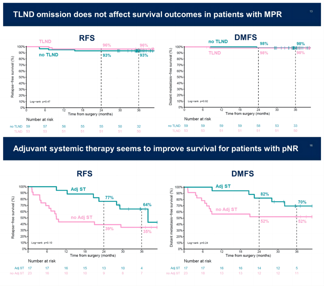新辅助IPI+NIVO后的MPR患者豁免TLND似乎不会影响RFS/DMFS。考虑到高生存率,辅助全身治疗不太可能给这些患者带来进一步的获益。在pNR患者中,增加辅助全身治疗,包括持续抗PD-1或改用BRAFi/MEKi似乎可以改善RFS和DMFS。