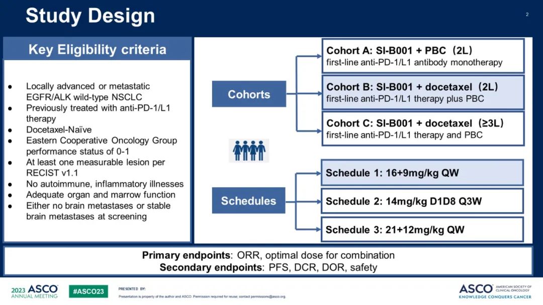 SI-B001是一种EGFR×HER3双特异性抗体,可同时靶向EGFR及HER3。2023 ASCO展示的II期、多中心、开放标签研究纳入接受过PD-(L)1疗法、未接受过多西他赛的局部晚期或转移性EGFR/ALK野生型NSCLC患者,患者的ECOG PS评分0-1,根据RECIST v1.1标准有至少一个可测量病灶。该研究包括三个队列,队列A的患者接受SIB001联合含铂双药化疗,队列B和队列C分别在2线和≥3线患者中给予SI-B001联合多西他赛。研究探索了SI-B001的最佳给药方案:方案1(16+9mg/kg,qw)、方案2(14mg/kg d1d8, q3w)和方案3(21+12mg/kg,qw)。主要终点为客观缓解率(ORR)和联合用药的最佳剂量。