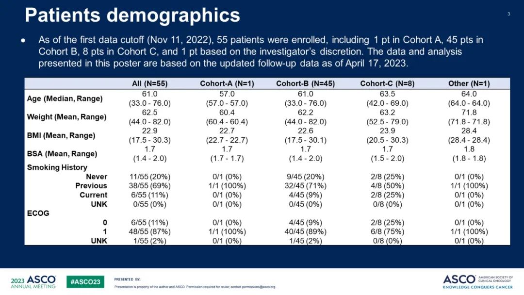 至2022年11月11日,该研究共入组了55例患者,中位年龄为61岁,大多数患者是当前或曾经吸烟者(11%/69%)。队列A有1例患者,队列B纳入了45例患者,队列C有8例患者。其中队列B有23例患者接受了方案1,21例患者接受了方案2,1例患者接受了方案3。
