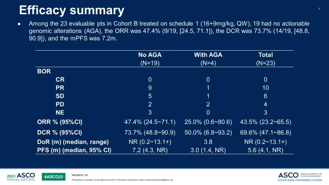 在队列B的23例接受方案1的患者中,ORR为43.5%(95%CI: 23.2~65.5),疾病控制率(DCR)为69.6(95%CI: 47.1~86.8),中位无进展生存期(PFS)达5.6个月。其中未携带突变基因的患者(n=19)的ORR达到了47.4%(95%CI 24.5~71.1),DCR为73.7%(95%CI: 48.8~90.9),中位PFS达7.2个月。