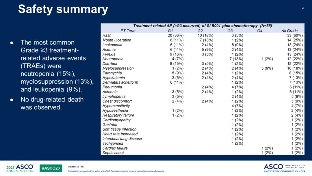 安全性可管理,最常见的≥3级治疗相关不良事件(TRAEs)为中性粒细胞减少(15%)、骨髓抑制(13%)和白细胞减少(9%),未出现与药物治疗相关的死亡。