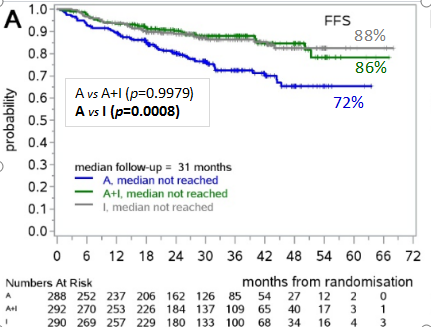 ① 对于TP53非突变、适合移植的MCL患者的治疗:2016年欧洲MCL协作组发起了一项随机、开放标签、国际多中心的III期临床研究(Triangle研究), 将既往未经治疗的年龄≤65岁、适合大剂量阿糖胞苷和ASCT的II-IV期MCL患者,以1:1:1的比例随机分配至3个试验组:R-CHOP/R-DHAP+ASCT(A组,标准治疗组)、R-CHOP+伊布替尼/R-DHAP+ASCT+伊布替尼维持2年(标准治疗组+伊布替尼,A+I组)和R-CHOP+伊布替尼/R-DHAP+伊布替尼维持2年(I组)。其结果显示:1) A组(标准治疗组,R-CHOP/R-DHAP+ASCT)中272例可评估患者的ORR和CR率分别为94%和36%,而合并A+I组/I组(R-CHOP+伊布替尼/R-DHAP)中559例可评估患者的ORR和CR率分别为98%和45%。2)在生存方面,A组(标准治疗组)的无失败生存期(FFS)未能优于I组,3年FFS率为72%(A组)vs 86%(I组;P=0.9979;HR 1.77);A+I组(标准治疗组+伊布替尼)的FFS优于A组(标准治疗组),3年FFS率为88%(A+I组)vs 72%(A组;P=0.0008;HR 0.52),详见下图。