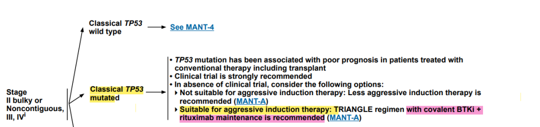 ③ 对于TP53突变MCL患者的治疗:对于TP53突变的MCL患者,目前NCCN指南新增了一项新的推荐治疗方案,即TRIANGLE方案+(BTK抑制剂+利妥昔单抗)维持治疗。