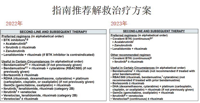复发及难治套细胞淋巴瘤(R/R-MCL)患者的治疗仍有较大挑战,2023年版NCCN指南推荐的解救治疗的优选方案主要包括:①阿卡替尼、泽布替尼这两种共价BTK抑制剂的连续应用 ②来那度胺+利妥昔单抗。其他的推荐方案还包括伊布替尼+利妥昔单抗。详见下图。