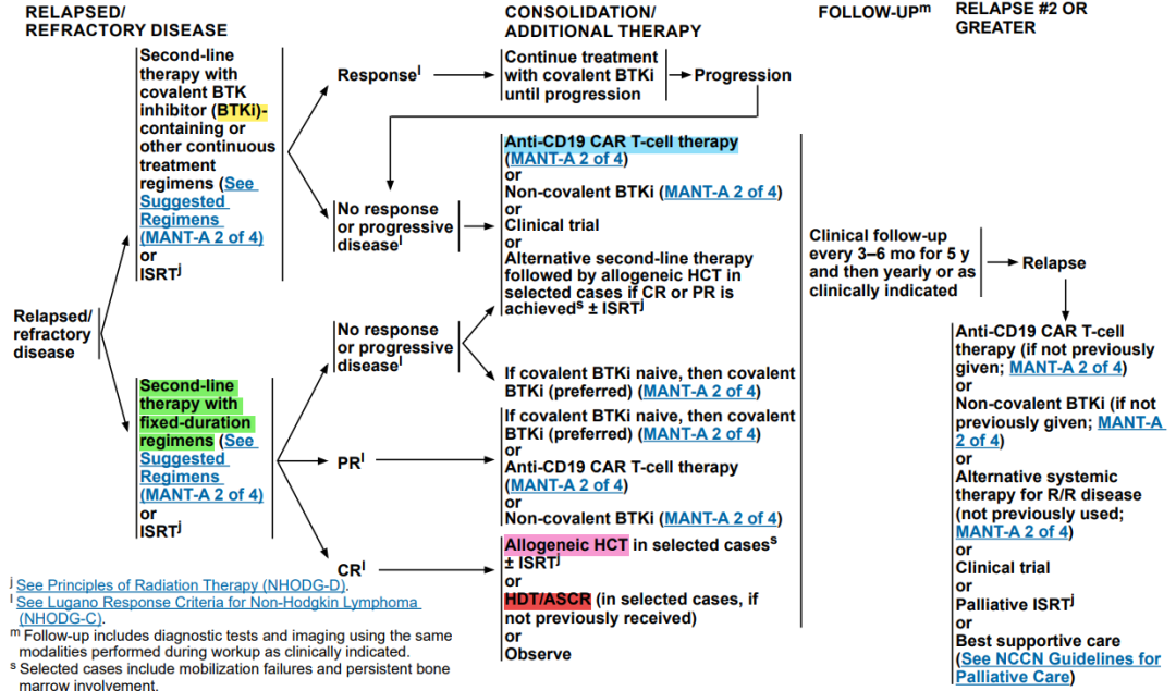 此外,对于复发及难治患者的治疗,NCCN指南给出了详细的治疗策略图,具体见下图。