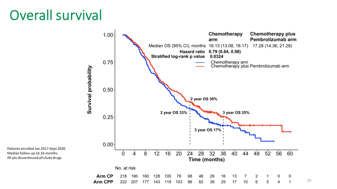 在未接受过治疗的胸膜间皮瘤患者中,在标准铂类-培美曲塞化疗的基础上加用帕博利珠单抗,在OS方面带来具有统计学意义和有临床意义的改善,死亡风险降低了21%(HR=0.79),中位OS分别为17.28个月和16.13个月(p=0.0324)。联合治疗组的2年(39% vs 33%)和3年OS率(25% vs 17%)更高。
