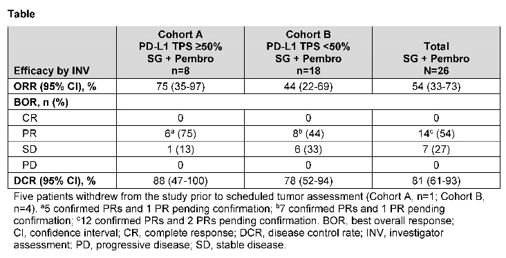 方法:既往未接受过治疗、无可作为治疗靶点的基因组改变、ECOG体能状态评分为0或1分的成人患者可被纳入队列A或B。PD-L1肿瘤比例评分(TPS)≥50%(队列A)和PD-L1 TPS<50%(队列B)的患者将接受SG(10 mg/kg,第1天和第8天)+帕博利珠单抗(200mg,每个周期第1天),21天一个治疗周期。试验终点包括ORR(根据RECIST v1.1)、无进展生存期、缓解持续时间、疾病控制率、总生存期和安全性。在本初步报告中,我们报告了接受≥1剂研究治疗的安全性可评估患者的安全性数据,以及随访≥13.0周的疗效可评估患者的疗效结果。