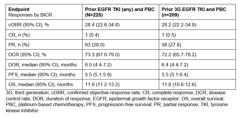 BICR确认ORR为28.4%;中位缓解持续时间(DOR)为6.0个月;中位无进展生存期(PFS)为5.5个月;中位总生存期(OS)的初步结果为11.9个月。既往接受过奥希替尼治疗的患者结局相似(表)。我们在治疗前不同HER3膜表达水平和发生不同EGFR-TKI耐药机制的患者中观察到临床活性。