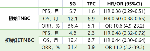 SG治疗mTNBC的Ⅲ期ASCENT研究纳入30%初始非TNBC的患者,而研究亚组分析表明,无论是否初始诊断为TNBC,SG均有显著的获益,结果见下[16]