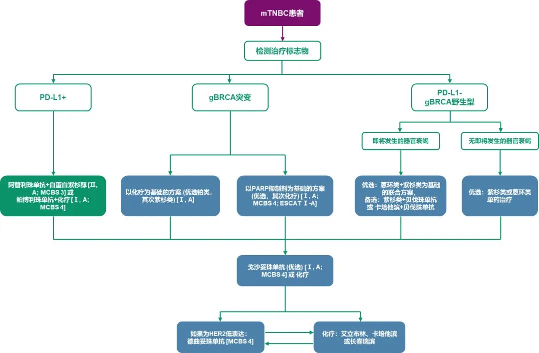 ESMO转移性乳腺癌在线指南推荐mTNBC首先检测相关标志物,以指导治疗方案的选择[1]