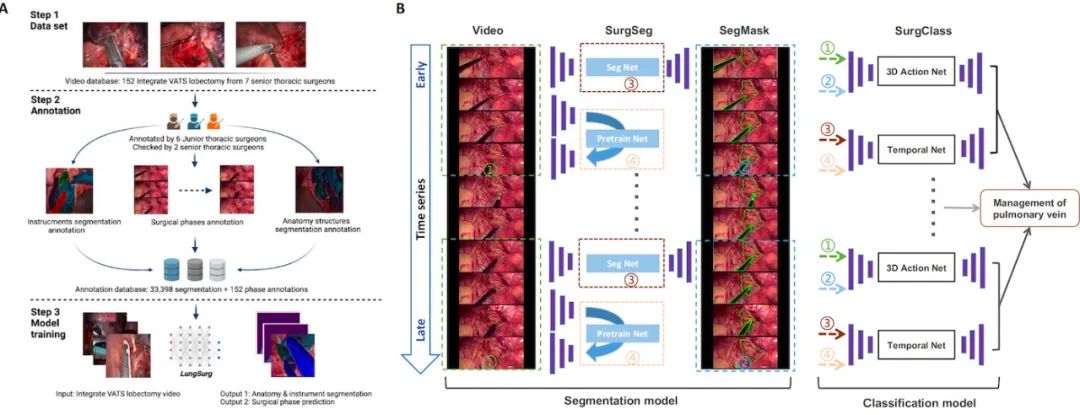今天,我们要介绍的是LungSurg系统,这个系统融合了两个强大的神经网络,一个用于分割胸腔内解剖结构和手术器械(SurgSeg),另一个用于识别手术阶段(SurgClass)。研究团队前瞻性地收集了152个VATS肺叶切除术视频,涵盖了超过一百万帧图像,这些图像详细标注了手术结构和阶段信息。