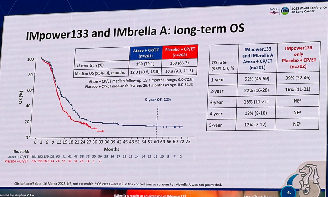 IMbrella A研究是一项开放标签、非随机、多中心的扩展研究,参与IMpower133研究的患者如果在研究结束时继续接受阿替利珠单抗治疗,且在当地无法获得研究治疗,或者在IMpower133研究中停用阿替利珠单抗且处于生存期随访中,则有资格转入IMbrella A扩展研究中。2023 WCLC发布的结果显示,在IMbrella A扩展研究中,12%的患者在接受阿替利珠单抗联合化疗治疗后的中位OS超过5年。