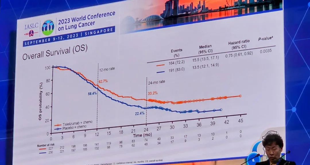 RATIONALE-312研究旨在比较替雷利珠单抗+依托泊苷+卡铂/顺铂方案与安慰剂+依托泊苷+卡铂/顺铂方案作为一线疗法治疗ES-SCLC患者的有效性与安全性。2023 WCLC公布了中位随访14.2个月的数据:替雷利珠单抗联合化疗为ES-SCLC患者带来了显著的生存获益,中位OS达到了15.5个月。