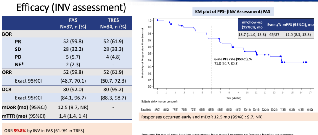 在肿瘤疗效可评估集(TRES,n=84)中,IRC评估的ORR与DCR分别为60.7%与95.2%,INV评估的ORR与DCR分别为61.9%与95.2%。所有亚组患者的疗效相似。安全性可耐受,未观察到新的安全性信号。总之,该研究证明赛沃替尼用于MET外显子14跳跃突变NSCLC一线治疗可为患者带来显著获益。